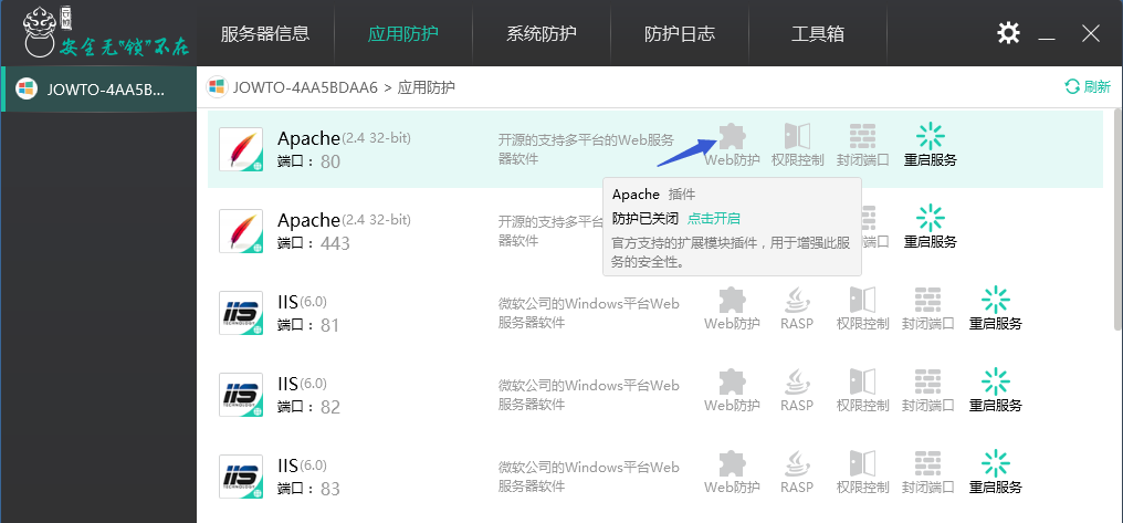 云锁使用过程中发现Web防护不生效,或者网站性能监控中获取不到网站了的问题。该问题通常是“Web防护”未开启导致的,通过PC控制端打开“应用防护”界面,开启“Web防护”功能即可。