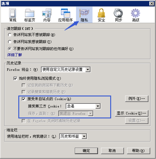 Firefox:打开选项,隐私项中检查是否接受Cookie。