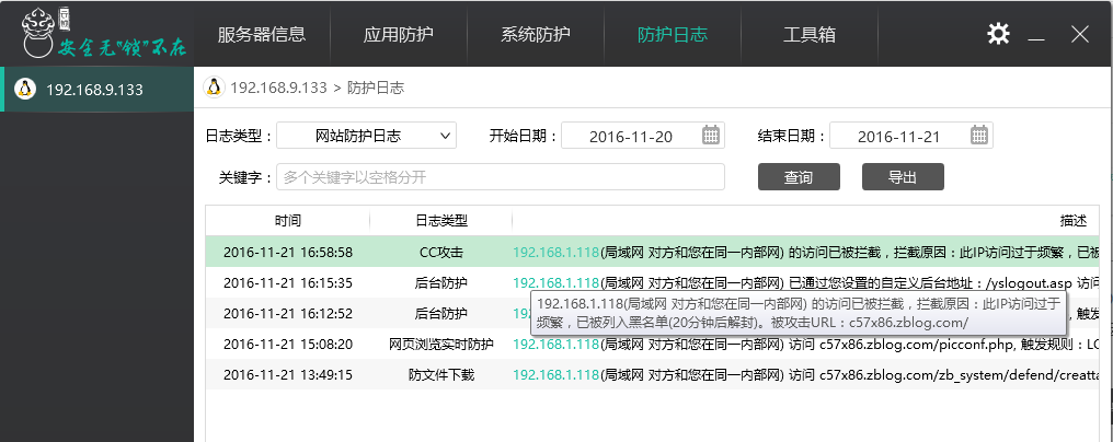 当网站受到攻击后通过防护日志可以看到CC攻击的日志,并可以看到攻击者的IP地址进行溯源。