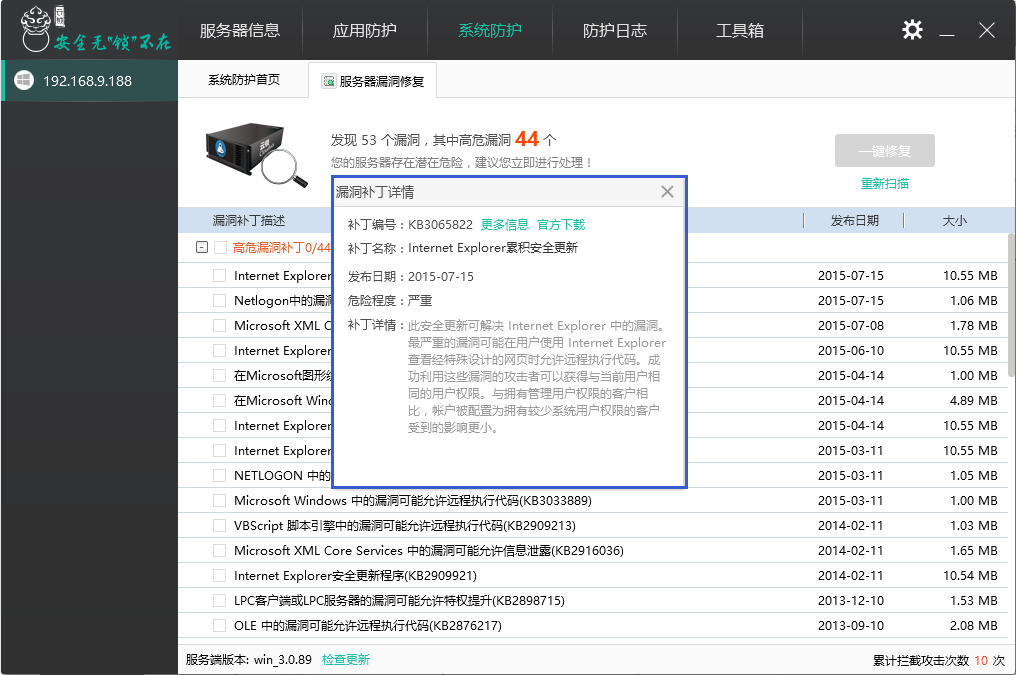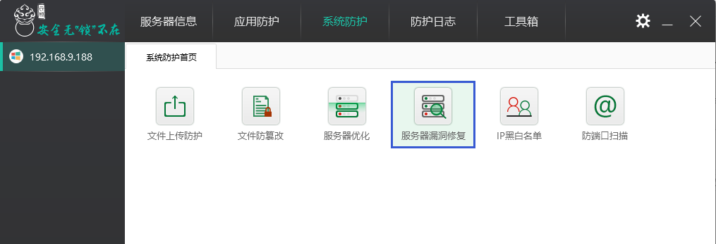 “系统防护”进入“服务器漏洞修复”,对服务器进行漏洞扫描。