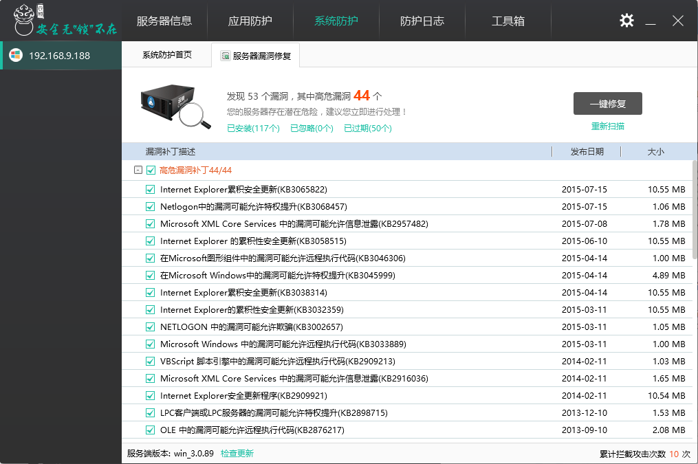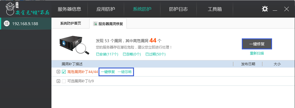 每次扫描完成后,都可看到已安装补丁、已忽略补丁和已过期补丁的数量,对当前服务器的漏洞状况有一个初步的了解。