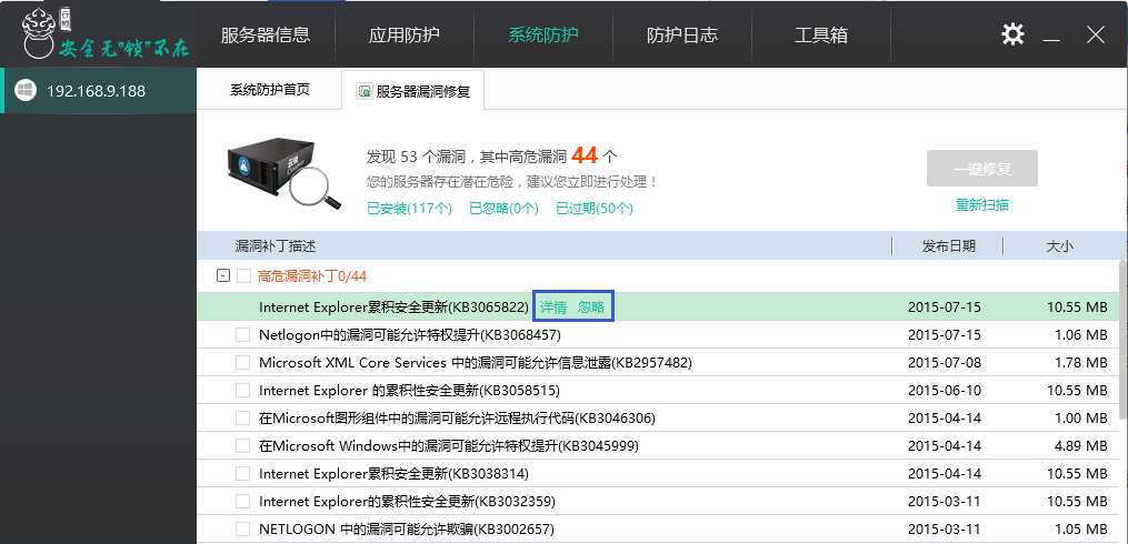 针对每一个漏洞都可以查看“详情”,了解补丁的详细信息,以便确实该漏洞是否修复,如不需要修复则可以选择忽略。