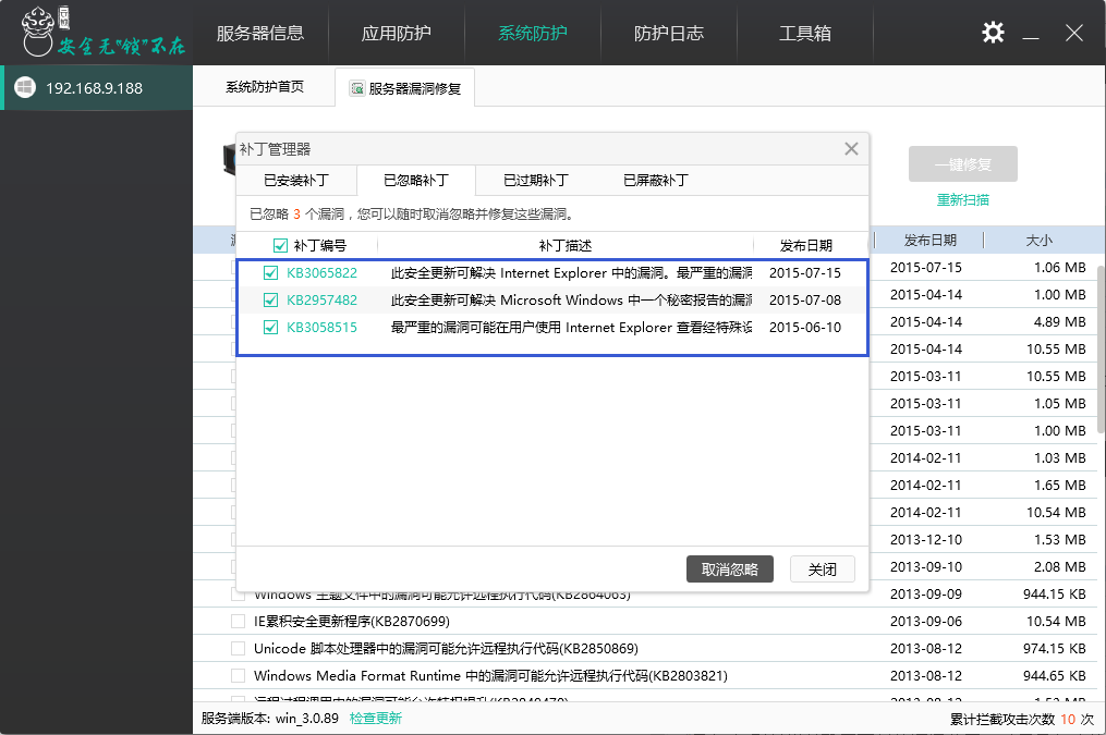 “已忽略”则是当前暂不更新的漏洞补丁,对于已忽略的补丁,当需要继续更新时则可选择取消忽略。