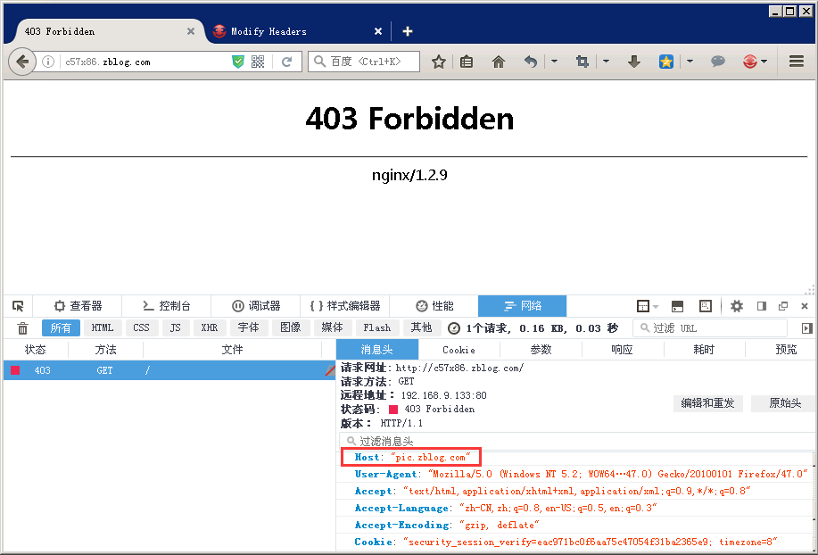 设置禁止通过c57x86.zblog.com访问服务器;当伪造该域名访问服务器时则会访问失败。